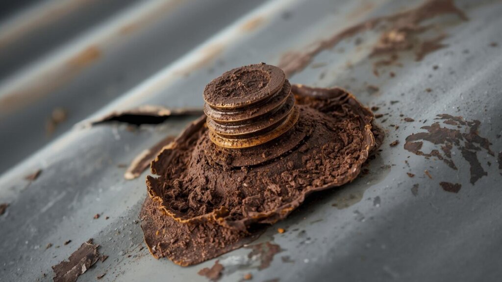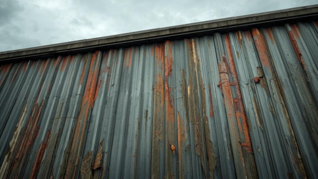- 「これはハゼ折板屋根で、この部分は塩害による腐食(白サビ・赤サビ)が進行しており、板厚が本来の0.6mmから0.4mmまで減少しています」