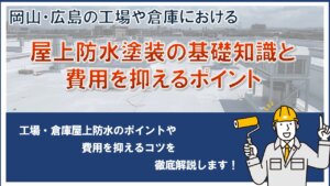 岡山・広島の工場・倉庫オーナー必見!屋上防水塗装の基礎知識と費用を抑えるポイント 岡山・広島で倉庫・工場の屋上防水・塗装なら【イマガワペイント】へ。完全自社施工だから中間マージンなしの適正価格で高品質を実現。雨漏り防止や遮熱対策で建物の寿命を延ばし、光熱費も削減します。屋上防水の基礎知識から費用相場、失敗しない業者選びのコツまで、地元のプロが分かりやすく解説。無料診断受付中。