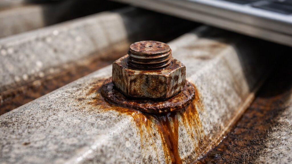 太陽光パネルの架台と屋根材の間(異種金属の接触部分)から電食(でんしょく)と呼ばれるサビが発生することもあります。