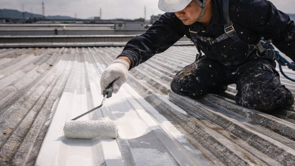 遮熱塗装で屋根面の温度上昇を抑えることは、工場内の暑さ対策になるだけでなく、パネルの裏面温度を下げ、発電効率を維持する「照り返し効果」も期待できるんですよ。