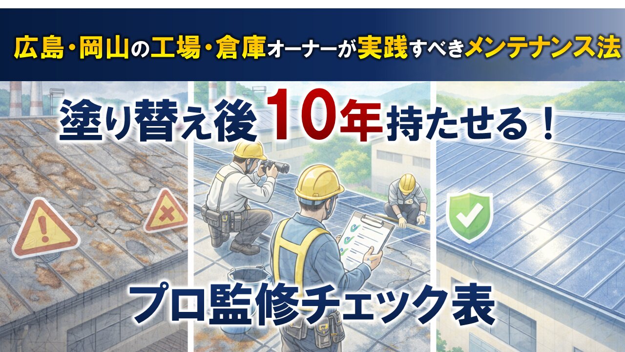 岡山・広島の工場・倉庫は特に梅雨・夏の日射・台風の影響を受けやすい。 - 年1回のセルフチェックと清掃が、10年持つ塗装の土台になる。