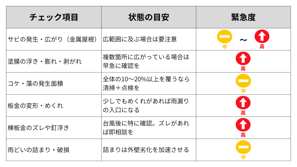 年に1〜2回、以下の項目を確認してみてください。「気になる」と感じた箇所は写真に撮っておくと、業者への相談がスムーズになります。